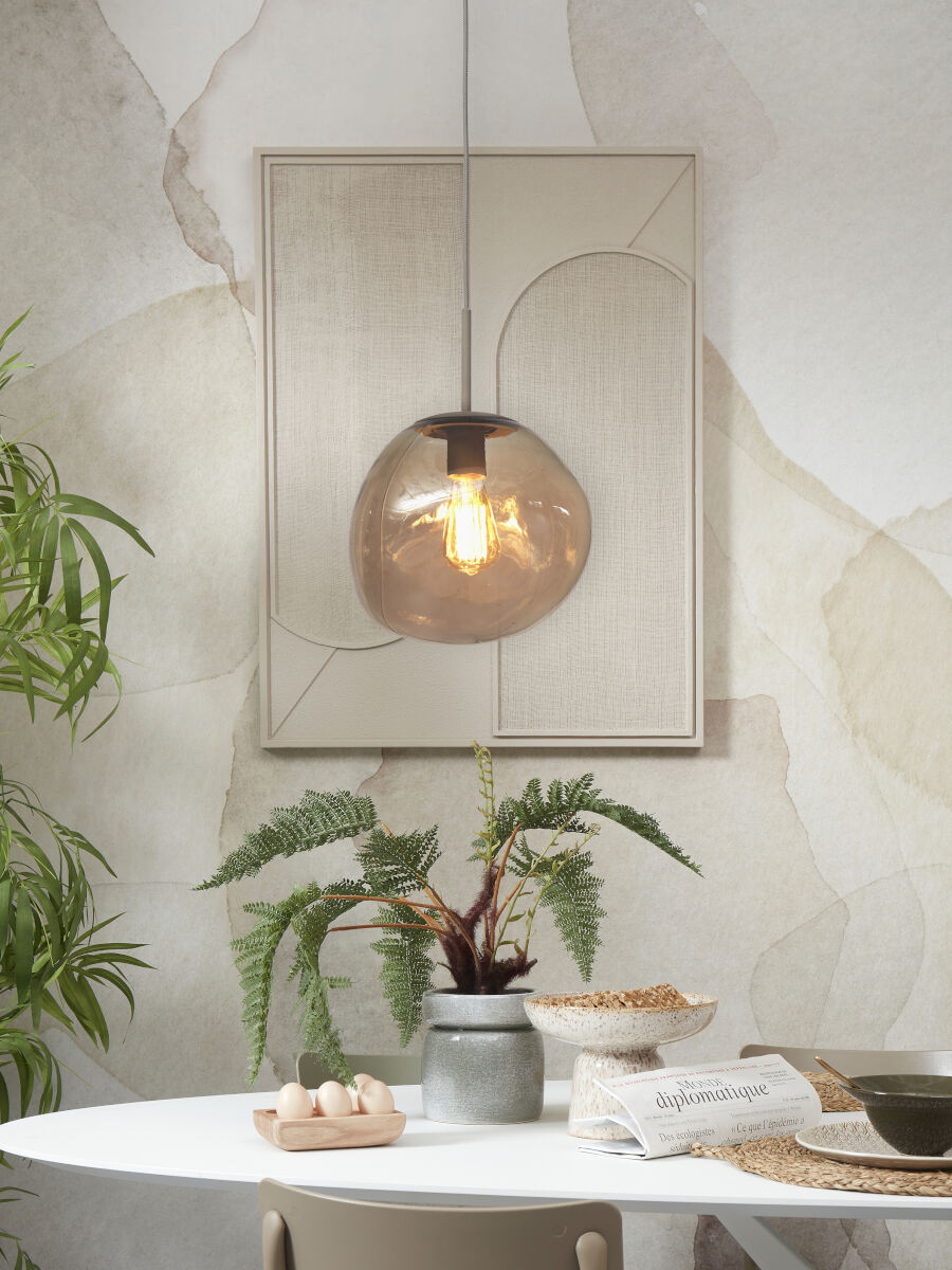 Moderne hanglamp van naturel metaal en glas, ideaal voor eetkamer, kantoor, slaapkamer of woonkamer. Voorzien van een grote E27 fitting en stofdicht (IP20). Deze lamp brengt een stijlvolle en uitnodigende sfeer in elke ruimte, perfect voor een moderne en elegante uitstraling.