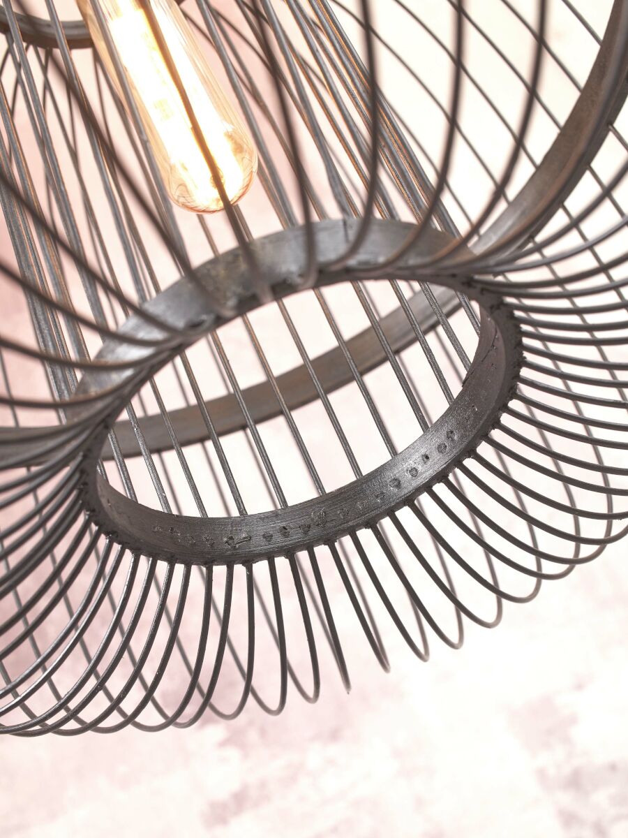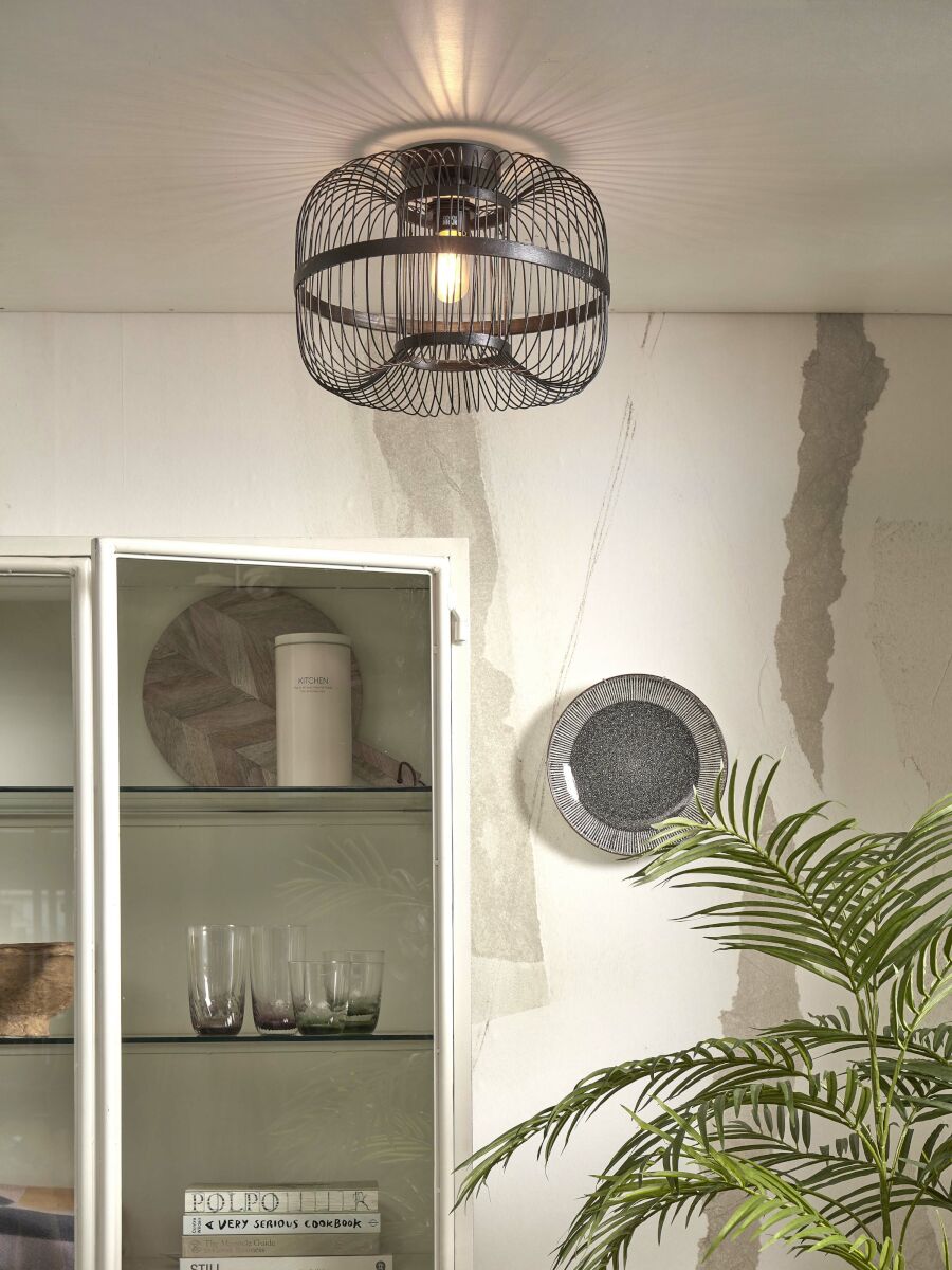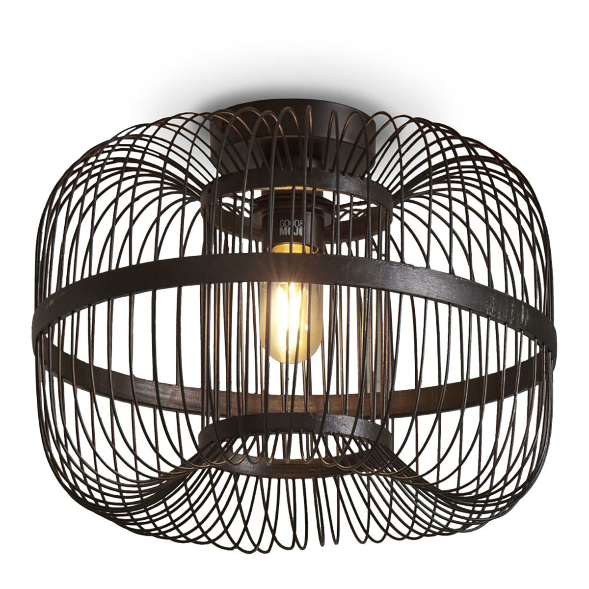 Oosterse zwarte metalen plafonnière van bamboe, ideaal voor eetkamer, hal, slaapkamer of woonkamer. Voorzien van een grote E27 fitting en stofdicht (IP20). Deze lamp brengt een exotische en warme sfeer in je interieur, perfect voor een unieke en stijlvolle ambiance.