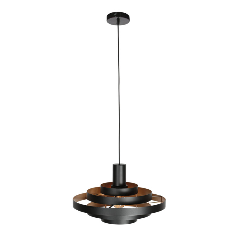 De Halo Cirque in het zwart is een stijlvolle hanglamp met vijf metalen ringen die in vorm variëren van smal naar breed en weer terug. Door de open ruimtes tussen de ringen ontstaat een speels lichtspel dat direct sfeer geeft aan de ruimte. De matzwarte buitenkant vormt een krachtig contrast met de goudkleurige binnenkant, wat zorgt voor een warme en luxe lichtreflectie. Deze lamp past perfect in moderne, industriële of chique interieurs.