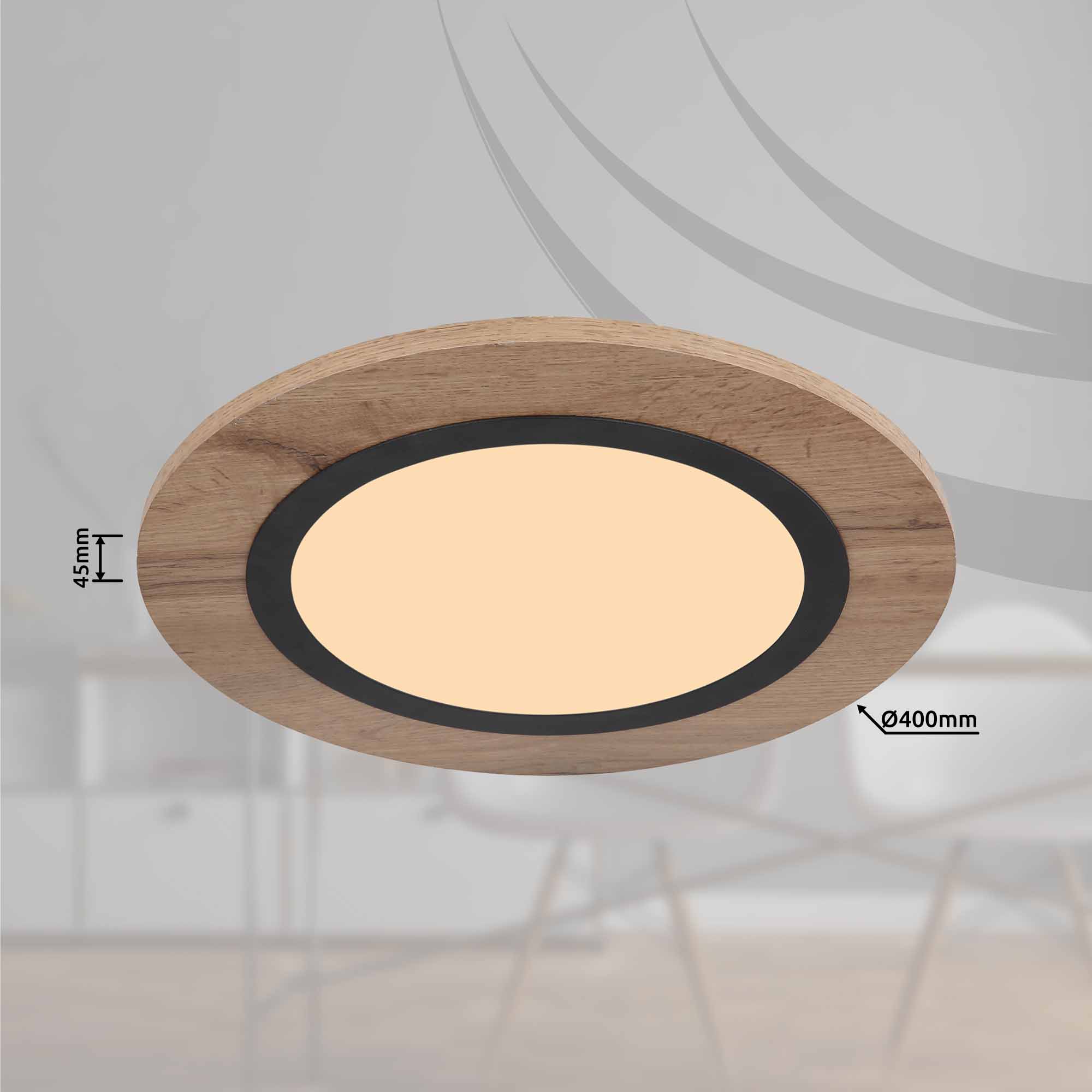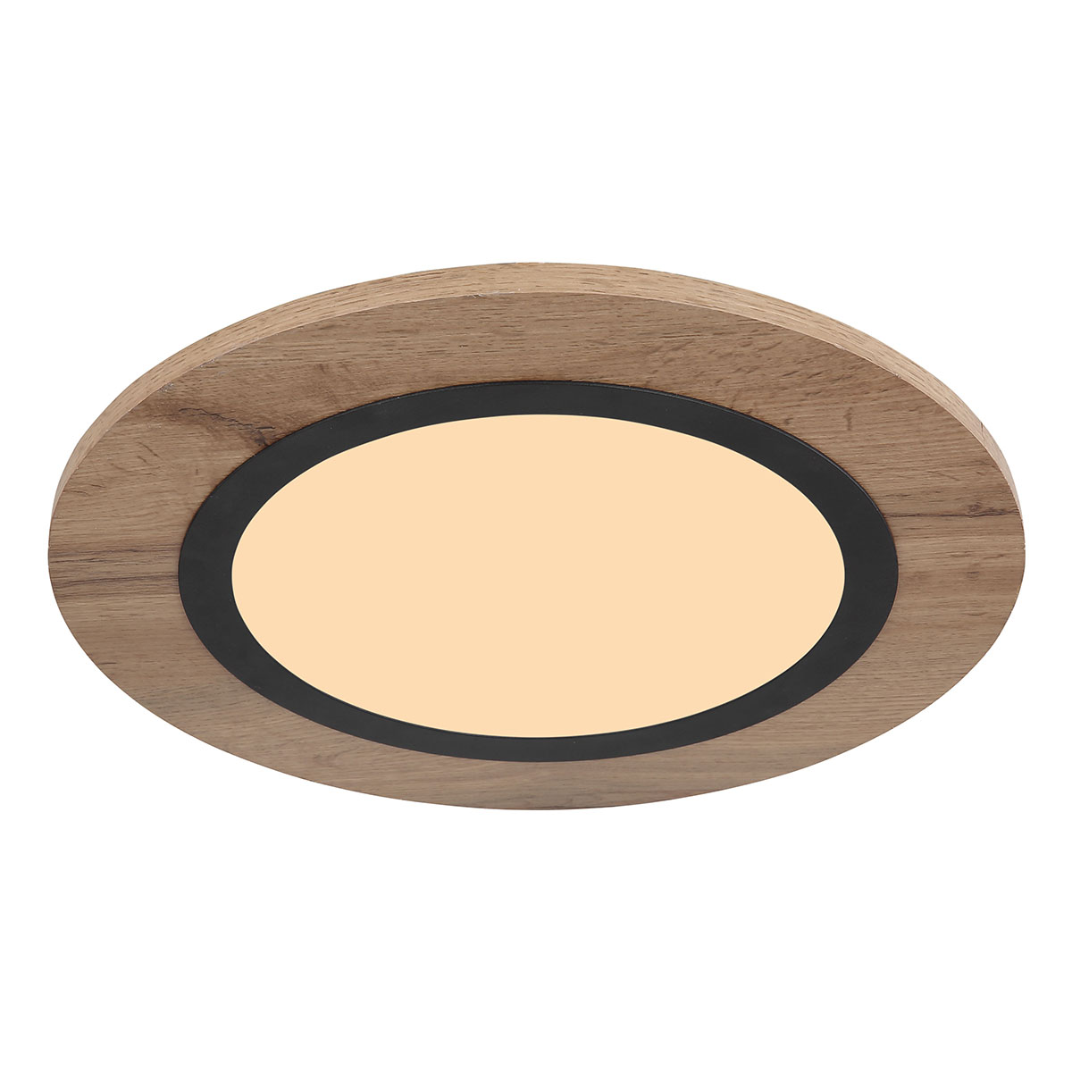 Ontdek de elegantie en eenvoud van de LEA-serie plafondlamp. Deze stijlvolle verlichtingsbron, geaccentueerd door een zwart mat plafondbevestigingsdeel, heeft een rond MDF frame met houtlook afwerking (diameter 40 cm) omhuld door een opaalkleurige kunststof kap. De lamp wordt ondersteund door een inbegrepen LED paneel dat een zacht, warm wit licht van 3000 Kelvin uitstraalt, perfect om een gastvrije sfeer te creëren. Geniet van een vleugje modern design gecombineerd met functionele belichting.