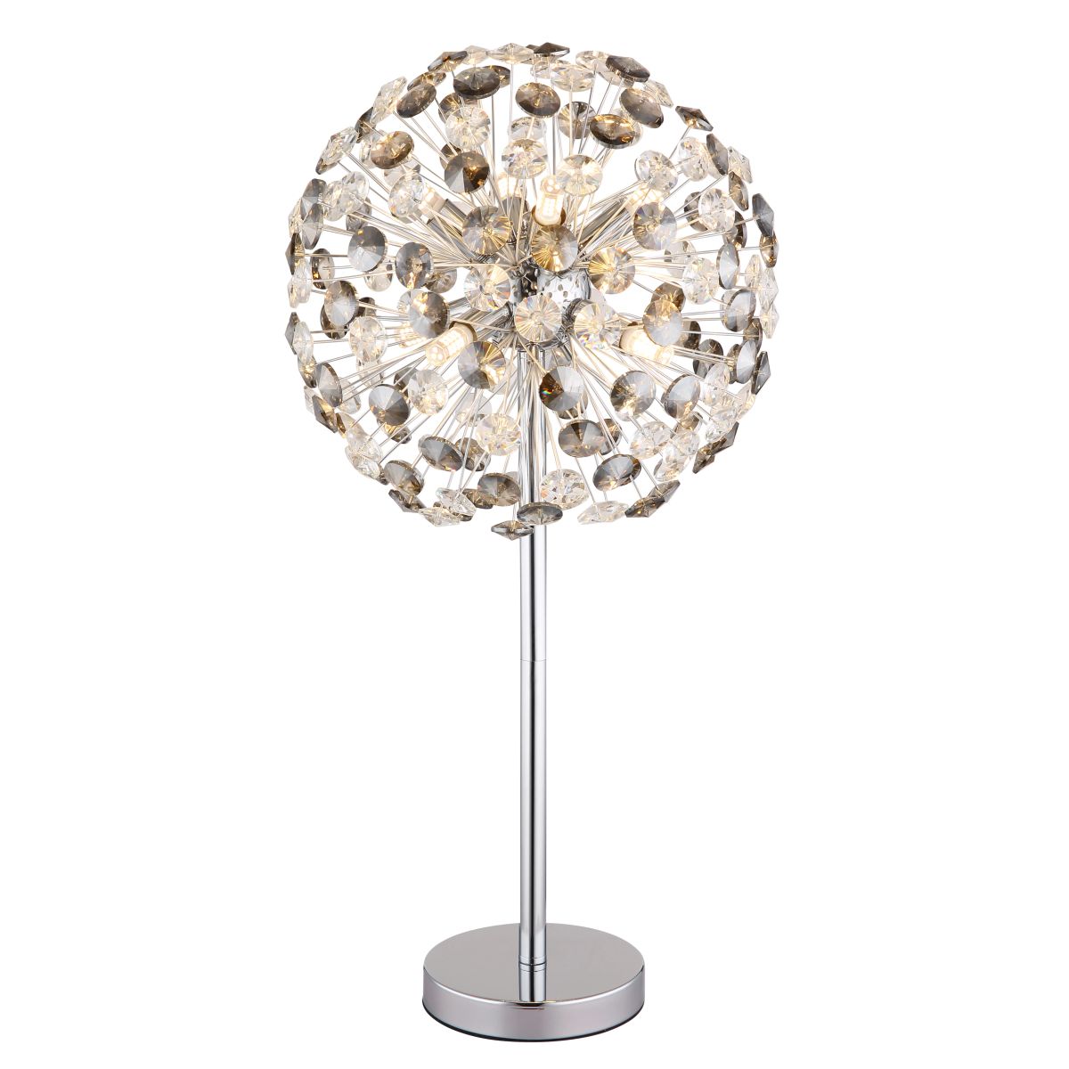 Ontdek de tijdloze schoonheid van de “KATRINA” ronde tafellamp, de perfecte toevoeging voor elk interieur. Deze lamp heeft een chroomgeplateerde metalen body en is voorzien van rokerige, heldere K9 kristallen, wat zorgt voor een elegante sfeer in uw ruimte. Het verfijnde armatuur is uitgerust met 8XG9 LED lampen die een warm licht uitstralen van 3000K en een helderheid van 350 lumen bieden. De K9 kristallen kap reflecteert het licht op een artistieke wijze, waardoor een betoverende lichtverspreiding in de kamer ontstaat.