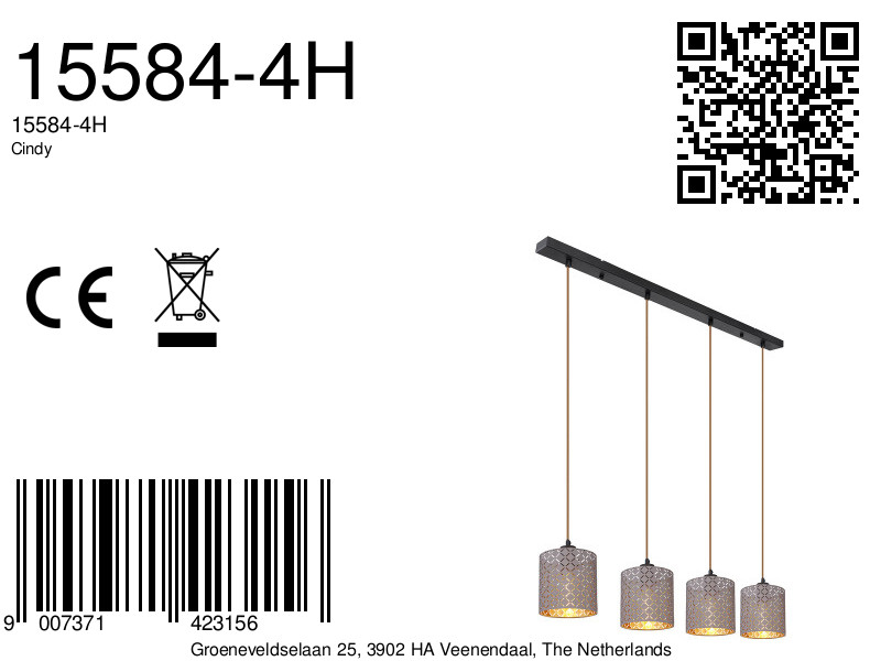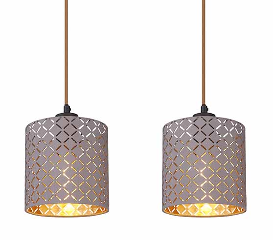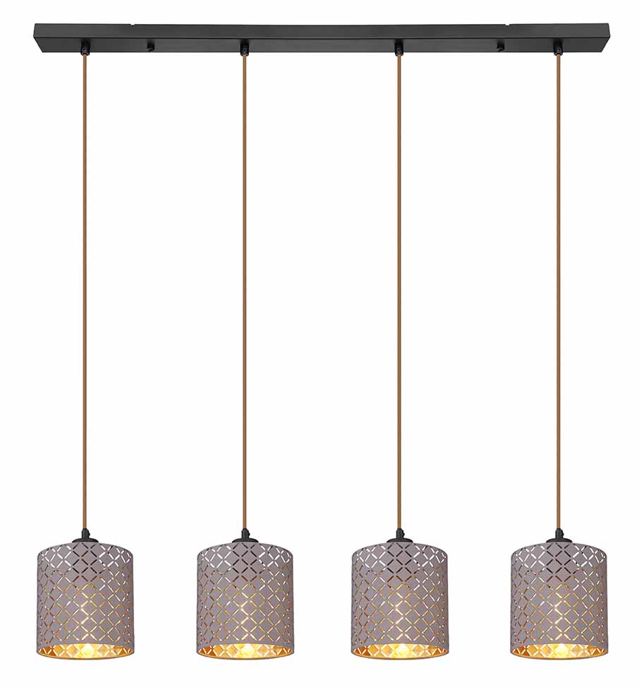 Deze hanglamp uit de Cindy-serie, met een lengte van 98 cm, heeft een zwarte matte metalen balk waar vier kabels met grijze textielkappen en elegante rasterpatronen aan hangen. Geschikt voor E27-lampen, waarmee u de lichtkleur en helderheid naar wens kunt instellen. De hoogte kan tijdens de installatie worden aangepast tot 150 cm. Combineer dit met andere modellen uit dezelfde serie voor een harmonieus interieur.