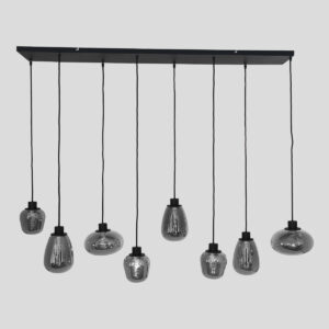 De 8-lichts hanglamp uit de Reflexion-serie heeft een langwerpige plafondplaat met een lengte van 145 cm. De rookglazen lichtbollen hangen op verschillende hoogtes en kunnen tijdens montage afzonderlijk worden versteld tot maximaal 160 cm. Voorzien van acht E27-fittingen, geschikt voor lichtbronnen tot 40 Watt (niet meegeleverd). Dimbaar met een externe dimmer.