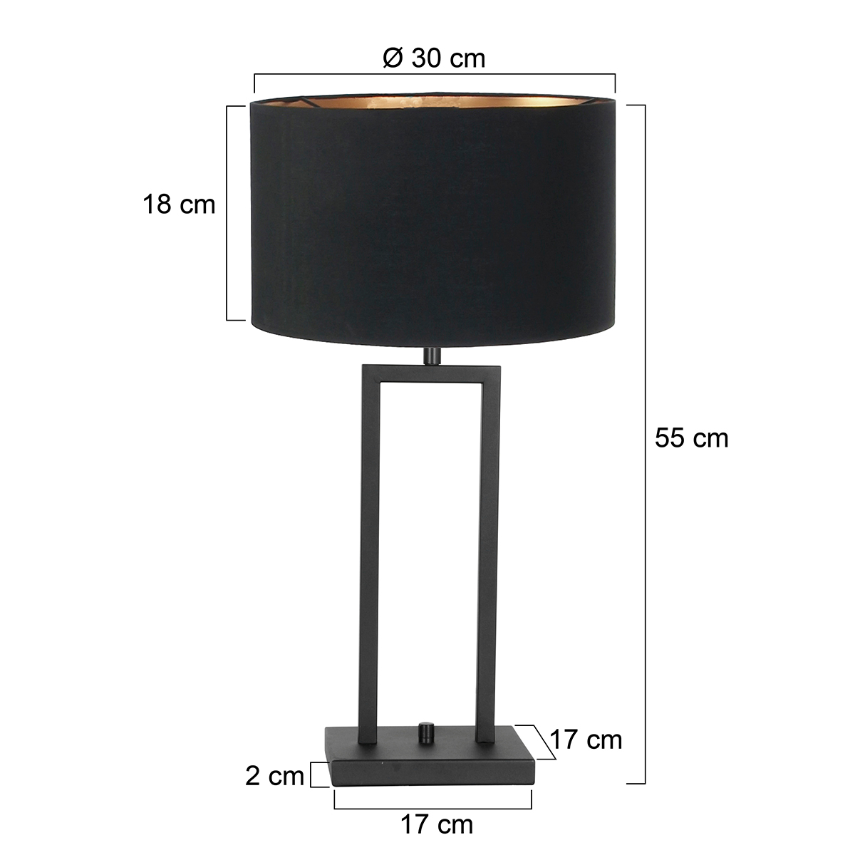 De breedte van de voet van de vloer- of tafellamp in centimeters.