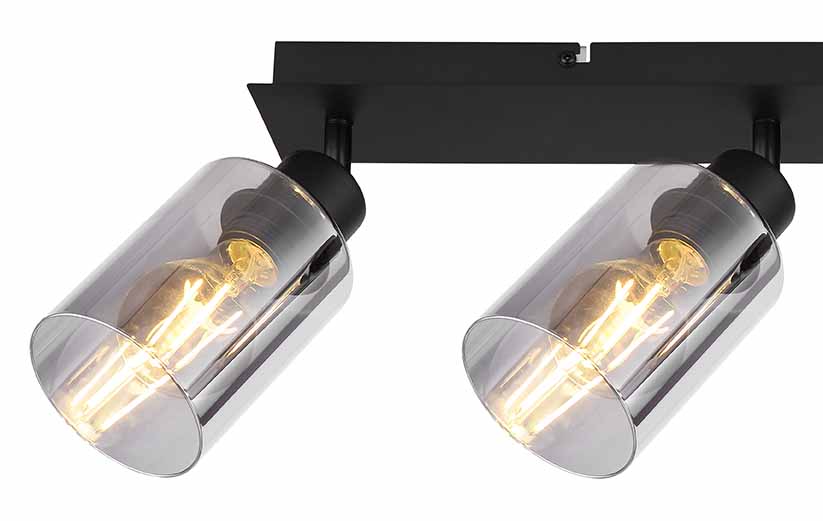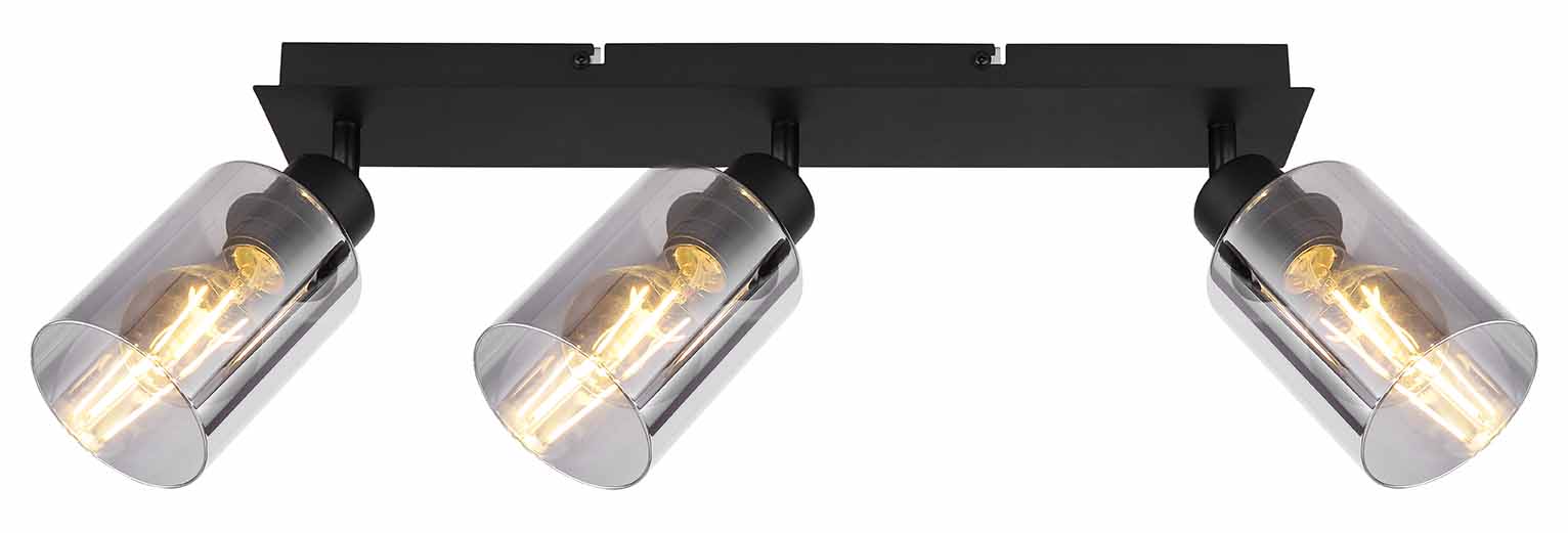 Deze spotlight van de Hadera-serie combineert een slank design met functionaliteit. Gemonteerd op een smalle zwarte mat metalen behuizing (47×9 cm), heeft het drie E27-fittingen, elk voorzien van een cilindrische kap in rookkleur (Ø9 cm). Ideaal voor diegene die de lichtkleur en helderheid zelf willen aanpassen, met een maximum van 40 watt per lamp.