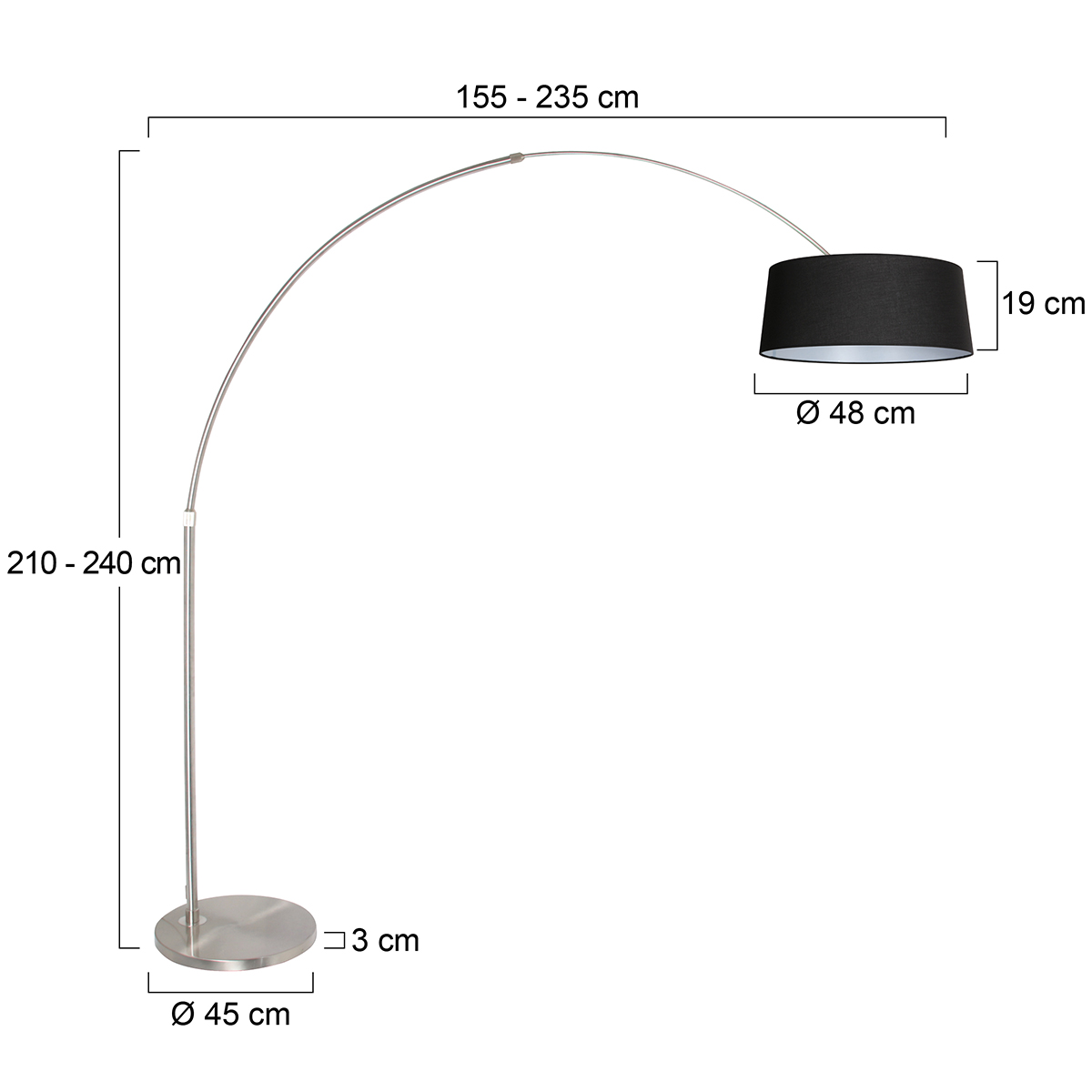 Deze combinatie bestaat uit de staalkleurige booglamp uit de Sparkled Light serie met de grijze linnen lampenkap van 48 centimeter. Het armatuur is vervaardigd uit metaal met een subtiel geborstelde afwerking en is in hoogte verstelbaar van 210 tot 240 centimeter. De kantelbare E27 fitting houdt de kap altijd recht en met het snoer van 250 centimeter met voetschakelaar bedien je de lamp moeiteloos.