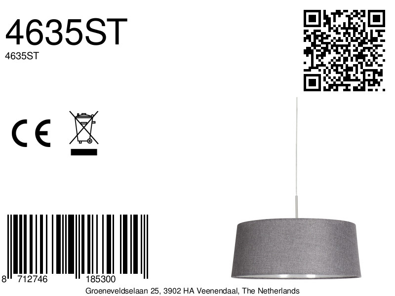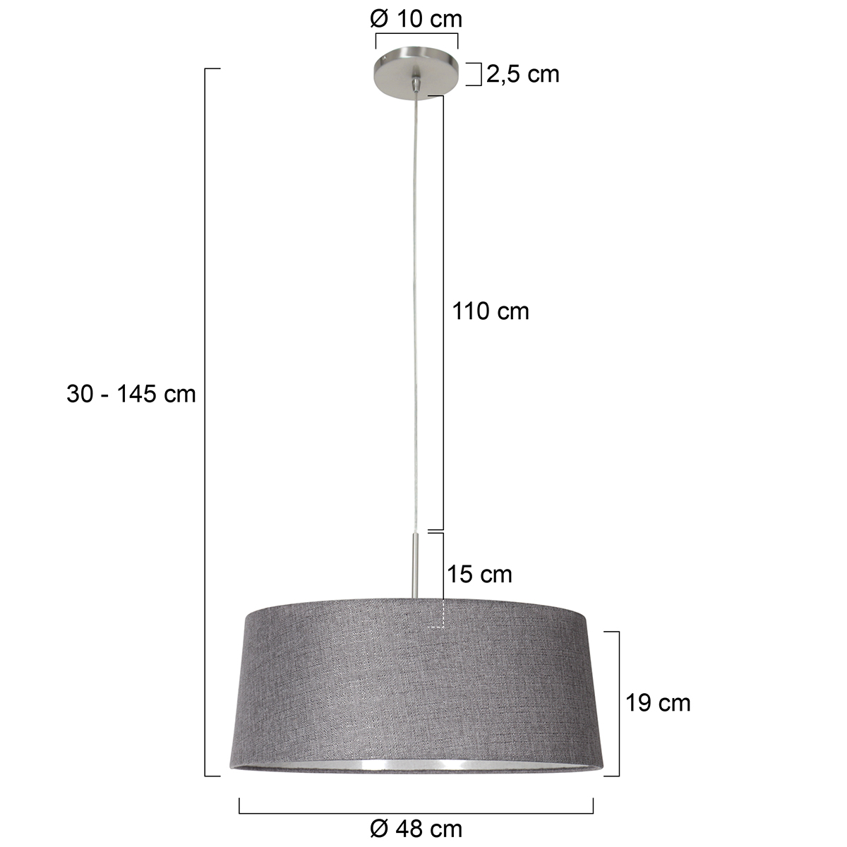 De grijze linnen kap geeft deze hanglamp een serene, moderne uitstraling. De rustige tint en het zachte textiel passen mooi in hedendaagse en Scandinavische interieurs, terwijl de witte binnenzijde zorgt voor een heldere en gelijkmatige lichtverspreiding.