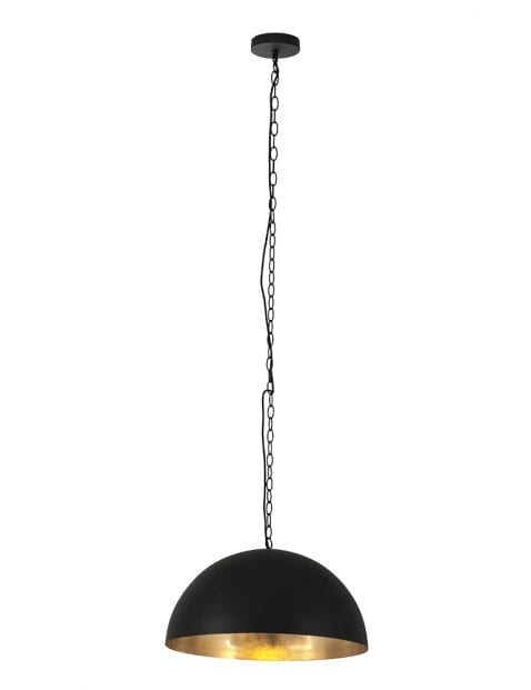 De zwarte bolvormige hanglamp uit de Semicirkel-serie heeft een robuuste uitstraling en een diameter van 50 cm. De binnenkant van de kap is afgewerkt met een goudkleurige folie, wat zorgt voor een warme lichtreflectie. De lamp is voorzien van een E27-fitting en geschikt voor lichtbronnen tot 40 watt (niet inbegrepen). De ophangketting kan tijdens montage worden ingekort tot een maximale hoogte van 160 cm. Dimbaar met een externe dimmer en een dimbare lichtbron.