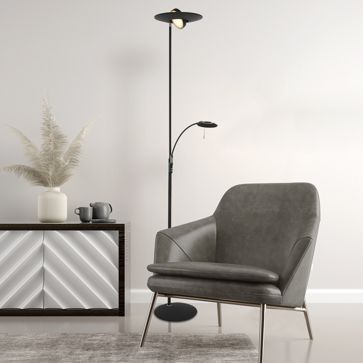 De moderne zwarte vloerlamp Zenith van Steinhauer combineert strak design met functionele verlichting. De leeslamp en uplighter zijn dimbaar en instelbaar in lichtkleur. Bedienbaar via pushdimmers op de buis. Met een hoogte van 185 cm en een tijdloze uitstraling past deze lamp moeiteloos in elk interieur.