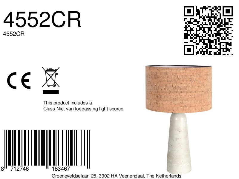 De Travino 4552CR is een luxe tafellamp met een natuurlijke uitstraling. De ronde kurken kap van 30 cm diameter zorgt voor een warme lichtverdeling en geeft de lamp een rustgevend karakter. De travertin voet vormt een stevig en elegant basisstuk met unieke kleurnuances en aders, waardoor elk exemplaar een exclusieve uitstraling heeft. Met een totale hoogte van 49 cm is deze lamp ideaal voor grotere nachtkastjes, consoles of dressoirs.