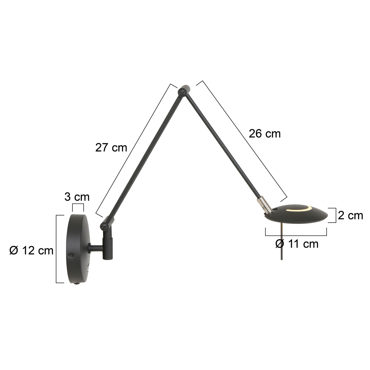 De zwarte wandlamp uit de Zodiac-serie is voorzien van een vervangbare LED-module van 6 watt (2700 Kelvin, 600 lumen). De pushdimmer op de wandplaat maakt het eenvoudig om de lichtsterkte naar wens in te stellen. De lamp is uitgerust met een knikbare en draaibare arm, waardoor je het licht precies kunt richten waar je het nodig hebt. De reikwijdte is verstelbaar tot maximaal 53 cm en de wandplaat heeft een diameter van 12 cm. Het snoer is 200 cm lang, wat een eenvoudige installatie mogelijk maakt.