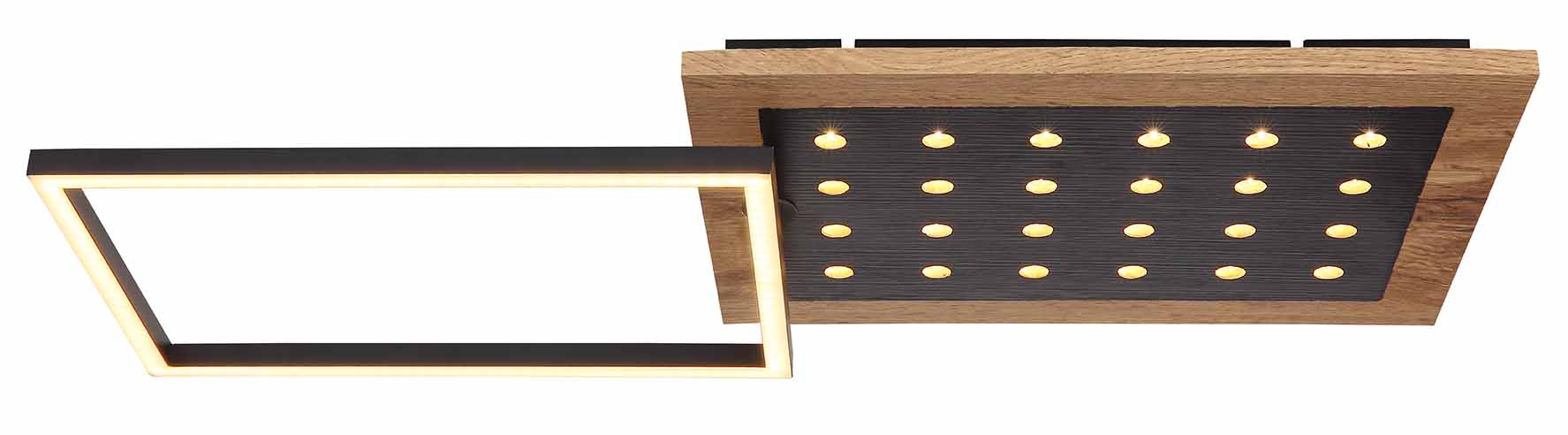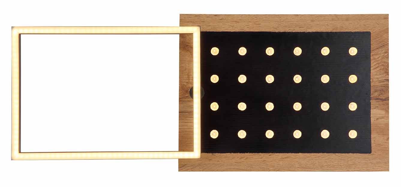 Geniet van de sfeer die gecreëerd wordt door deze hippe plafondlamp, gekenmerkt door z’n stijlvol LED frame dat aanpasbaar is in positie. Daarnaast wordt de lamp gecompleteerd door een stevige MDF plaat die een rustieke houtlook uitstraalt en is voorzien van bijkomende LED-verlichting, met oppervlakteafmetingen van 63cm lengte bij 27cm breedte. Het straalt een aangenaam warm wit licht uit van 3000 Kelvin, dat verstelbaar is in drie standen via een simpele schakelaar aan de muur. Bovendien behoudt de lamp je laatste voorkeursinstelling dankzij de geïntegreerde geheugenfunctie.