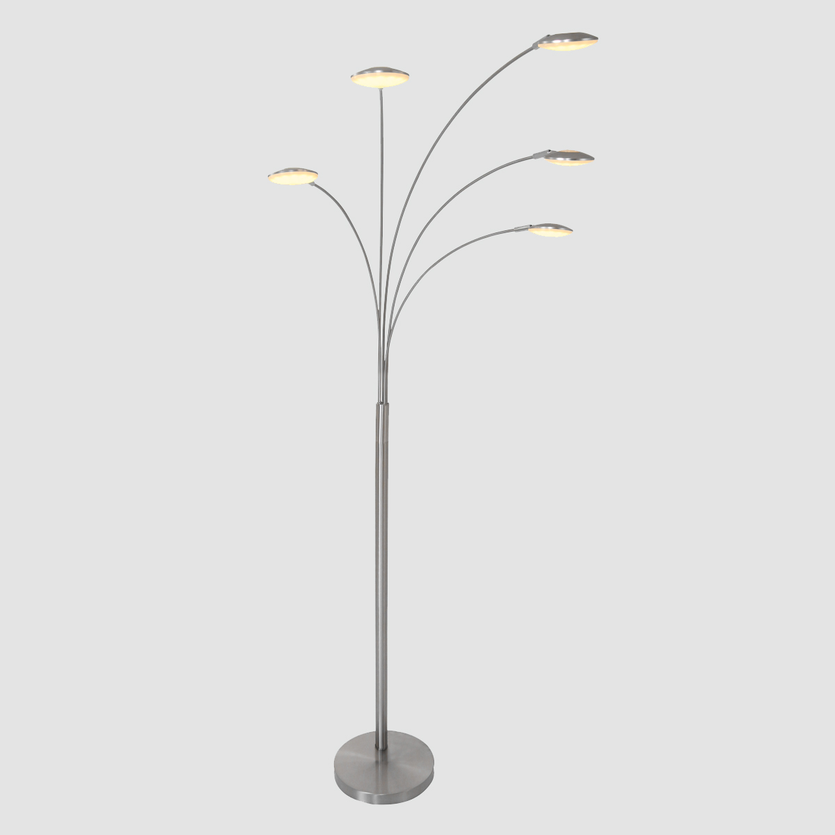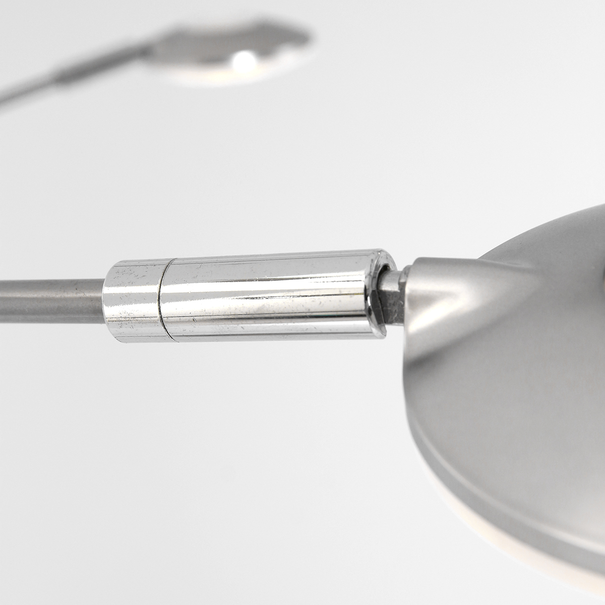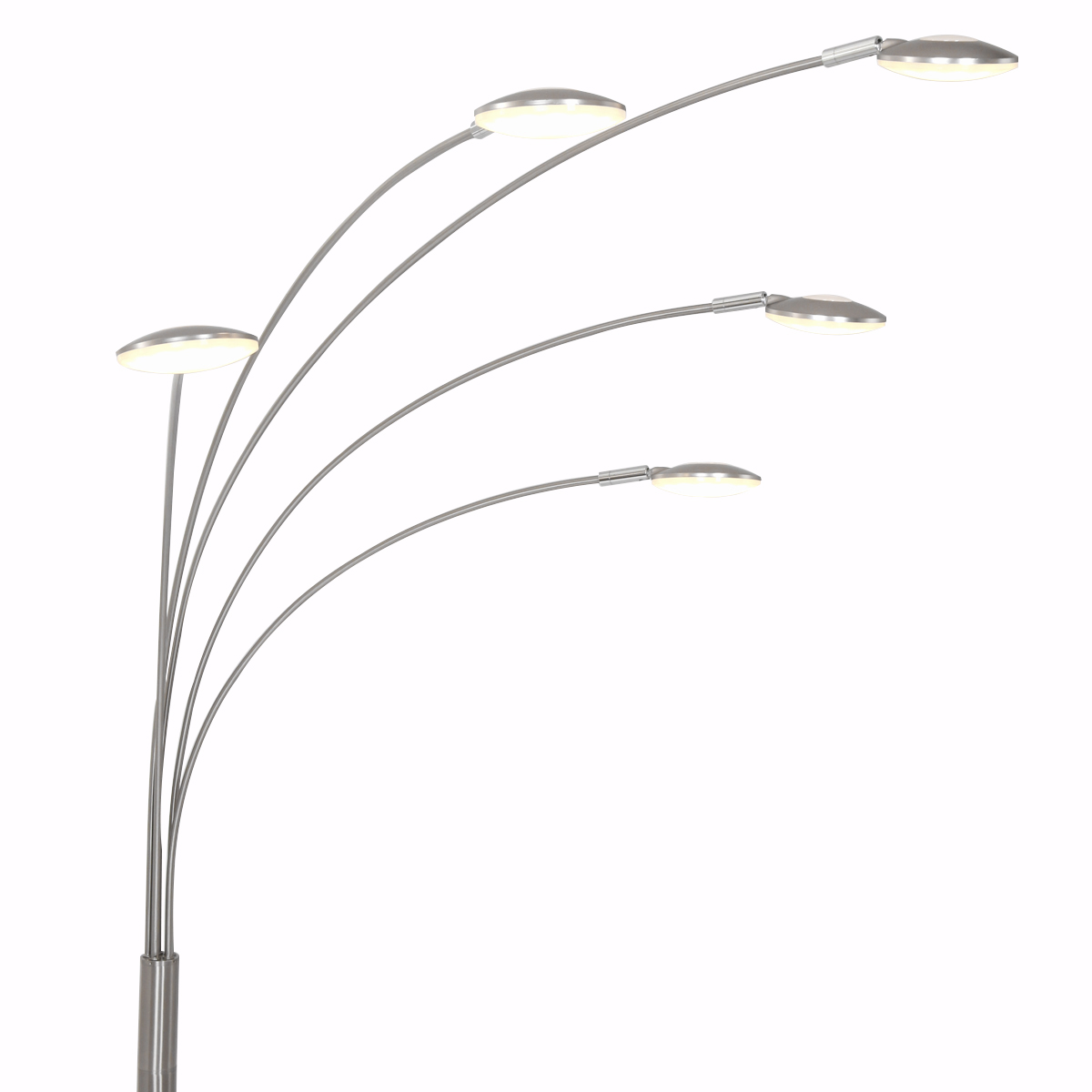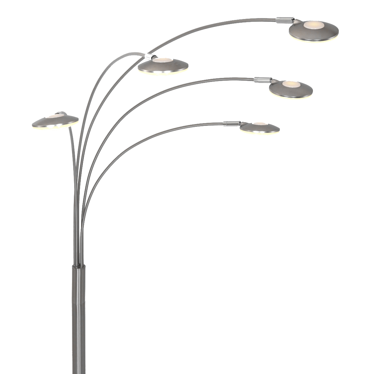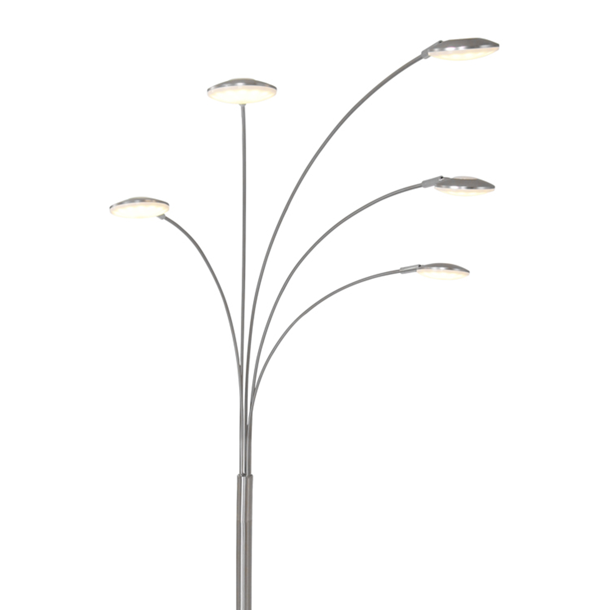 Deze opvallende 5-lichts vloerlamp uit de Synna-serie heeft een geborsteld stalen afwerking en een moderne, industriële uitstraling. De vijf afzonderlijke armen zijn flexibel en de kappen, met een diameter van 9,5 cm, kunnen individueel worden versteld. De lamp is voorzien van geïntegreerde LED-lichtbronnen van 4,5 watt per stuk, met een kleurtemperatuur van 2700 Kelvin en een lichtopbrengst van 500 lumen per lichtpunt.