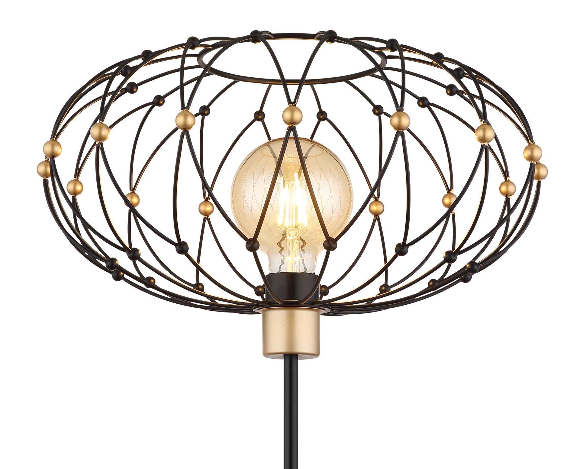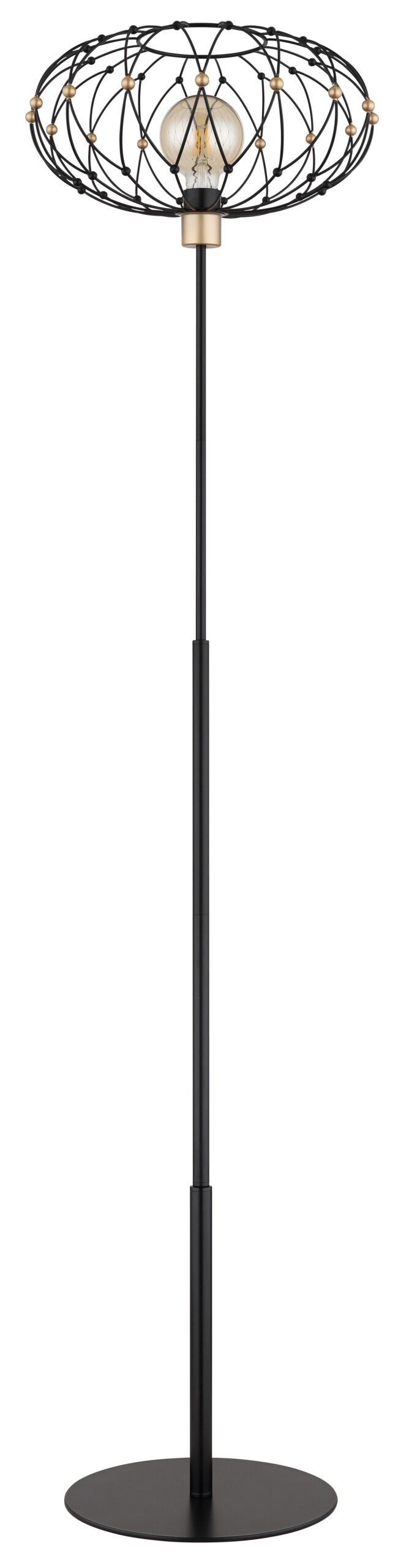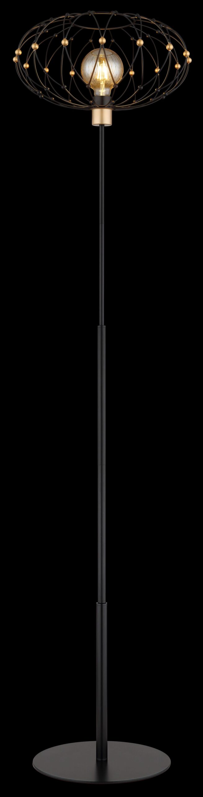 De GRAYS vloerlamp in vintage stijl brengt een perfecte mix van industriële charme en luxe accenten naar uw interieur. Met zijn ronde metalen gaasafdekking in matte zwart en elegante gouden decoratieve bollen, schept deze lamp een warme en uitnodigende sfeer in elke ruimte. Het zwarte metalen lichaam vormt een prachtig contrast met de verfijnde details van de kap. Daarnaast zorgt de voetpedaalschakelaar in de kabel voor een gemakkelijke bediening van het in- en uitschakelen.