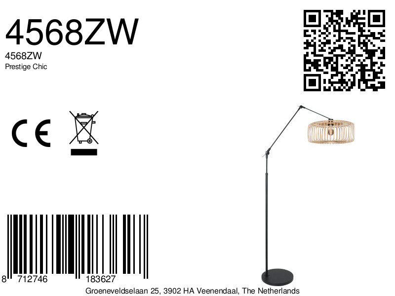 De Prestige Chic 4568ZW is een stijlvolle vloerlamp met een slanke zwarte basis en een verfijnde bamboekap. De kap heeft een diameter van 50 cm en een hoogte van ongeveer 21 cm en zorgt voor een zachte, sfeervolle lichtspreiding met een natuurlijk karakter. De hoogte van de lamp is variabel van circa 115 tot 250 cm, waardoor je de lichtval eenvoudig afstemt op de zithoek, leesplek of open ruimte.