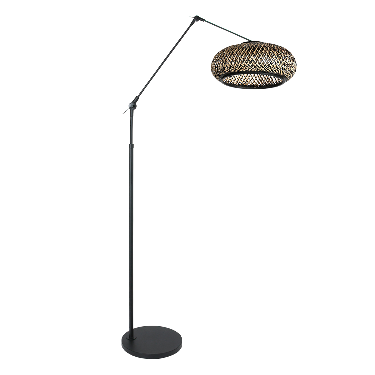 Deze Prestige Chic vloerlamp heeft een royale bamboekap van 50 cm met een karaktervolle gevlochten structuur. De combinatie van het zwarte armatuur en de naturel-zwarte kap zorgt voor een stijlvolle mix van modern en natuurlijk design. De in hoogte verstelbare arm (115 tot 250 cm) maakt de lamp flexibel inzetbaar voor zowel zithoeken als ruime woonkamers.