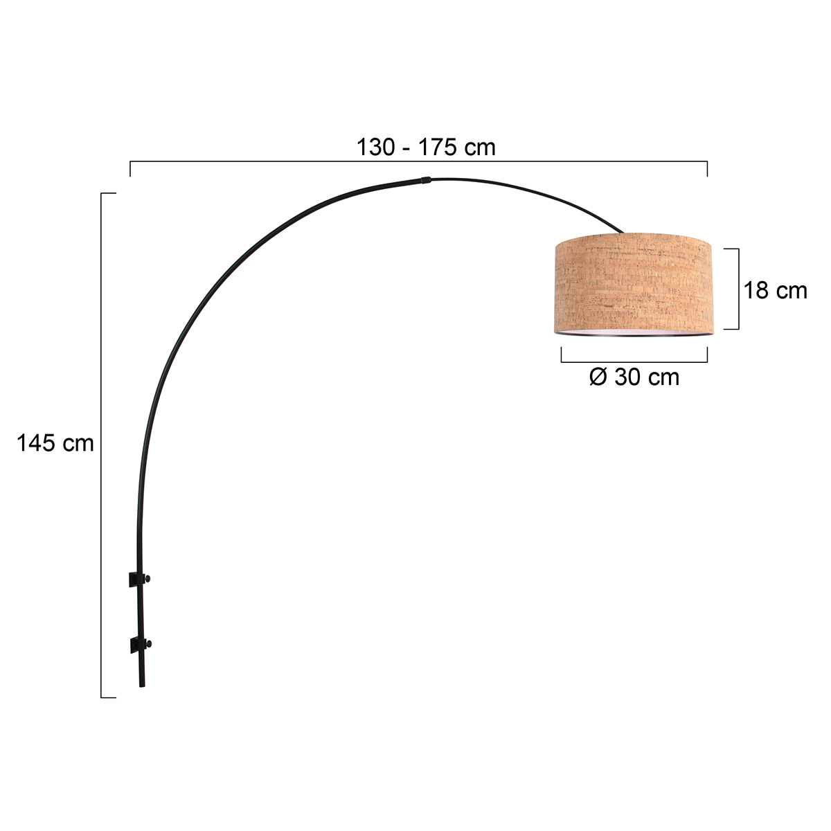 De Sparkled Light 4343ZW is een opvallende wandlamp met een grote, tonvormige kurken kap van 40 cm diameter en 20 cm hoogte. De combinatie van het zwarte metalen frame en het natuurlijke kurk zorgt voor een spannend contrast en een warme lichtsfeer. Met een vaste hoogte van 145 cm en een reikwijdte die instelbaar is tussen ongeveer 130 en 175 cm hang je deze wandlamp perfect boven een bank, eettafel of werkplek zonder plafondpunt nodig te hebben.
