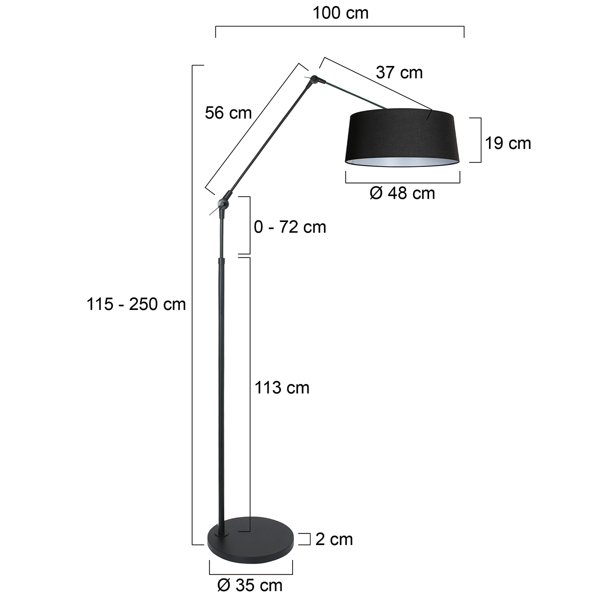 Deze combinatie bestaat uit de zwarte booglamp uit de Prestige Chic serie met daarbij de zwarte linnen lampenkap van 48 centimeter. Het armatuur heeft een verstelbare knikarm, een solide metalen constructie en een kantelbare E27 fitting zodat de kap altijd netjes recht hangt. Het aansluitsnoer van 220 centimeter is voorzien van een voetschakelaar voor extra gebruiksgemak.