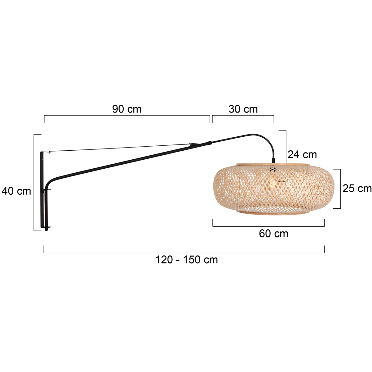 Deze wandlamp heeft een verstelbare reikwijdte van 120 tot 150 cm en is daardoor perfect boven een bank, eettafel of werkplek te plaatsen. De lamp beschikt over een royale bamboe kap van 60 cm, gecombineerd met een strak zwart metalen frame. De natuurlijke uitstraling van bamboe geeft het interieur een warm accent.