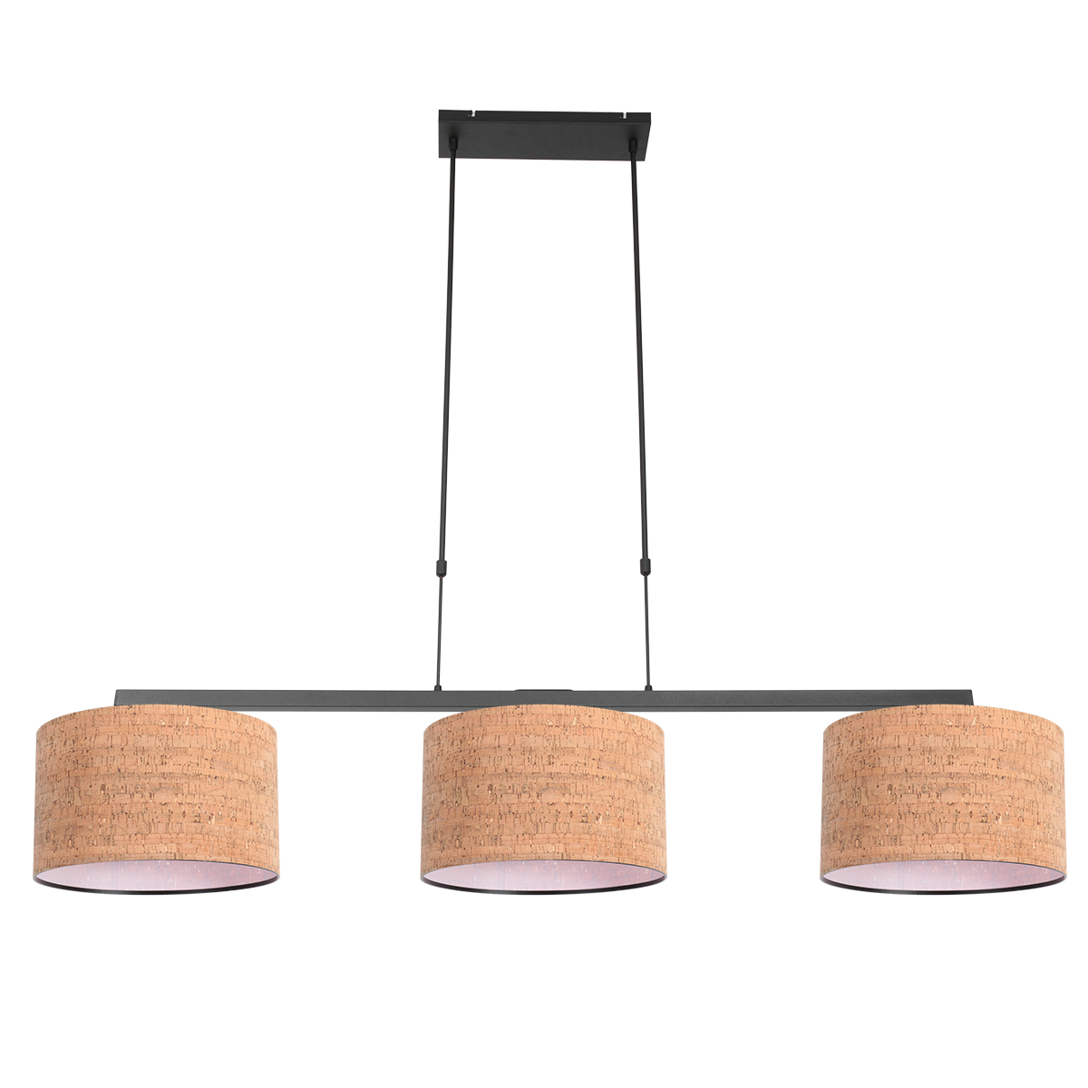 Deze zwarte 3-lichts hanglamp vormt een elegante combinatie met drie compacte ronde kurken kappen van 30 centimeter diameter en 18 centimeter hoogte. Met een breedte van 120 centimeter en drie E27 fittingen heb je de vrijheid om verschillende lichtbronnen te kiezen. Dankzij de verstelbare hoogte tussen 85 en 155 centimeter hang je de lamp eenvoudig op de ideale hoogte boven de eettafel of keukenbar.