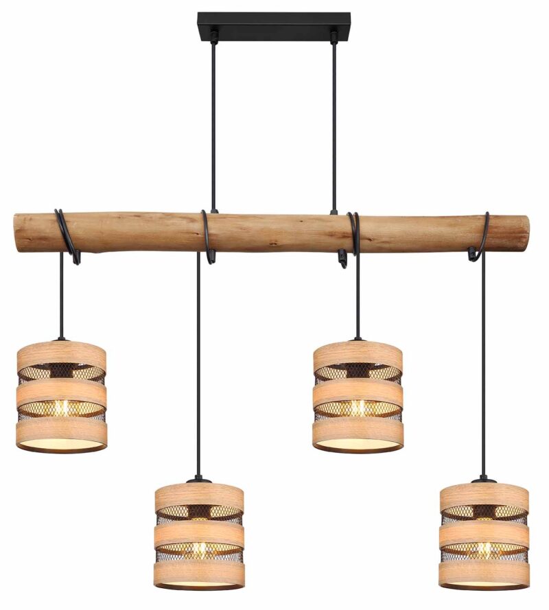 Deze geweldige hanglamp inspireert met zijn eenvoudige ontwerp. Vier E27-aansluitingen hangen aan een zwarte kabel tot 1,2 m gewikkeld aan een smalle houten balk (85x15cm) van het plafond. De E27-stopcontacten zijn voorzien van een prachtige kap van metalen roosters en houtlook decoraties. Hiermee kunt u de lichtkleur en helderheid bepalen tot een maximaal vermogen van 40 watt.