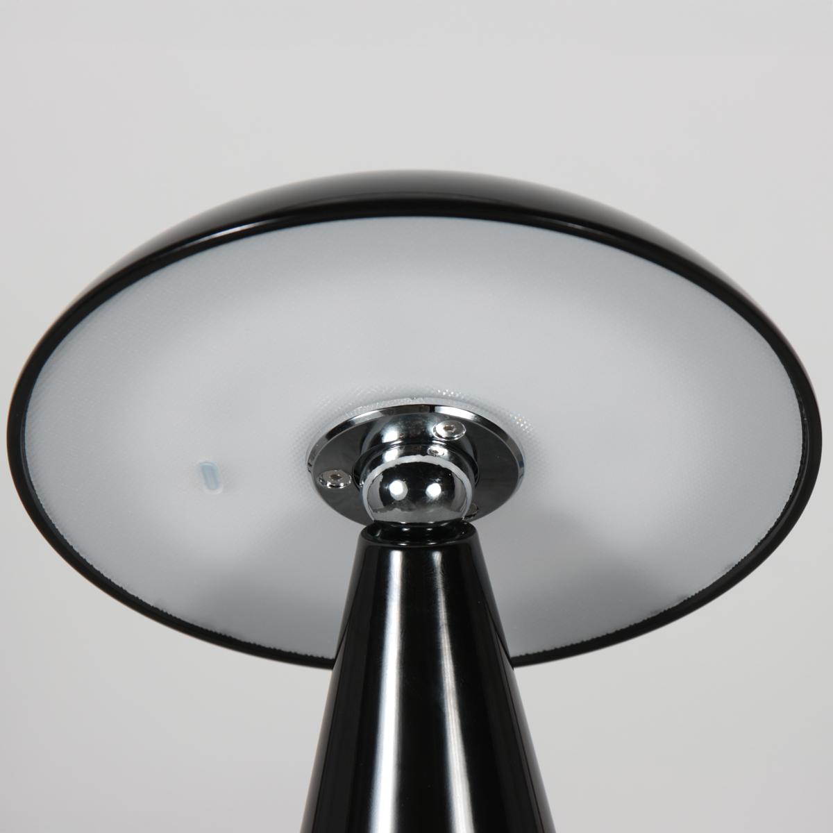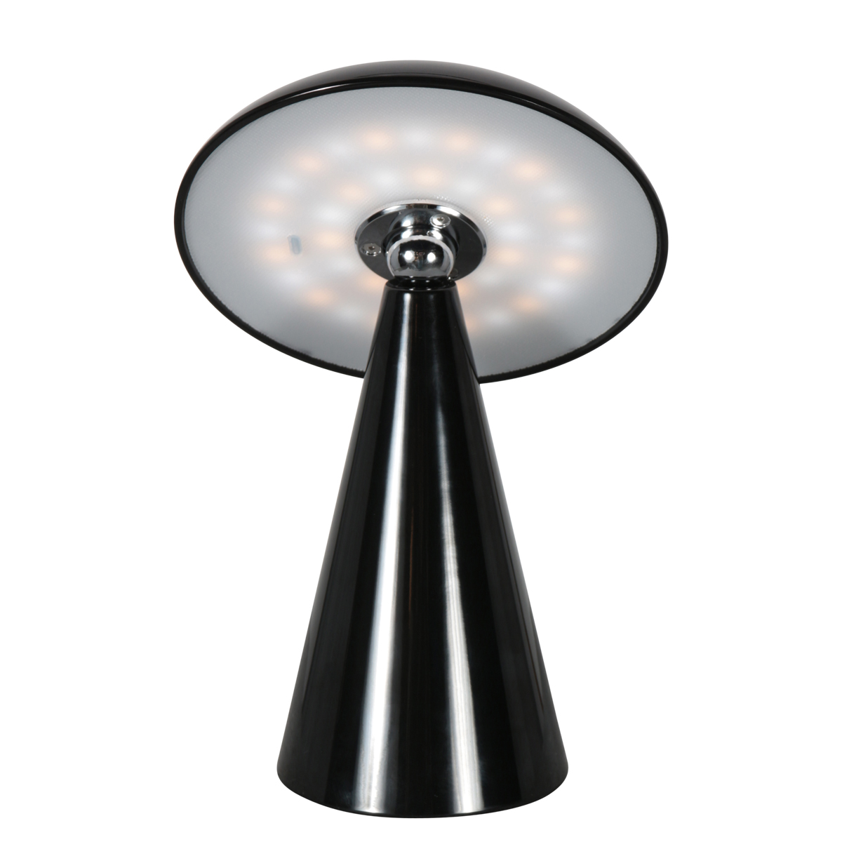 Deze zwarte oplaadbare tafellamp in paddenstoelvorm heeft een krachtige en moderne uitstraling en vormt een stijlvol accent in het interieur. Door het draadloze ontwerp is de lamp flexibel te plaatsen, bijvoorbeeld op een nachtkastje, bijzettafel of bureau. De kantelbare kap zorgt ervoor dat het licht eenvoudig gericht kan worden.