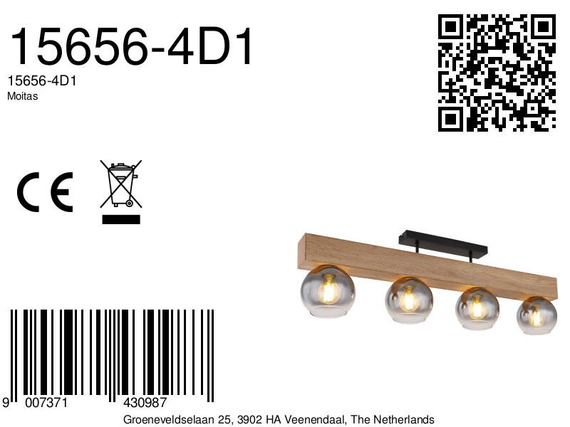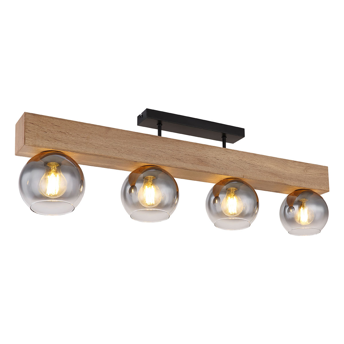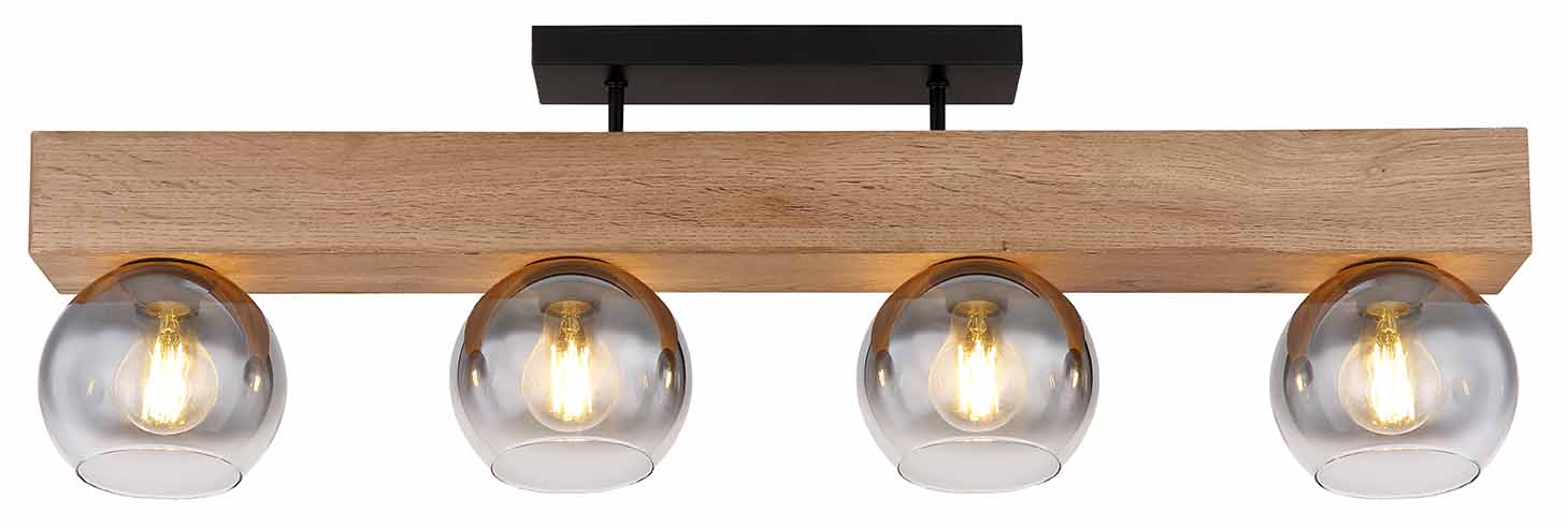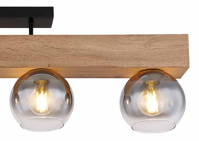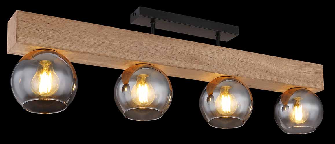 Deze prachtige plafondlamp uit de MOITAS-serie inspireert met een geweldig design. Twee korte metalen staven steken uit een rechthoekige zwarte plafondbevestiging naar een blok in houtlook (90x15cm). Er zijn vier E27-stopcontacten, elk met een glazen kap in rookkleuren. Met de E27-aansluitingen kunt u zelf de lichtkleur en helderheid bepalen tot een maximaal vermogen van 40 watt.
