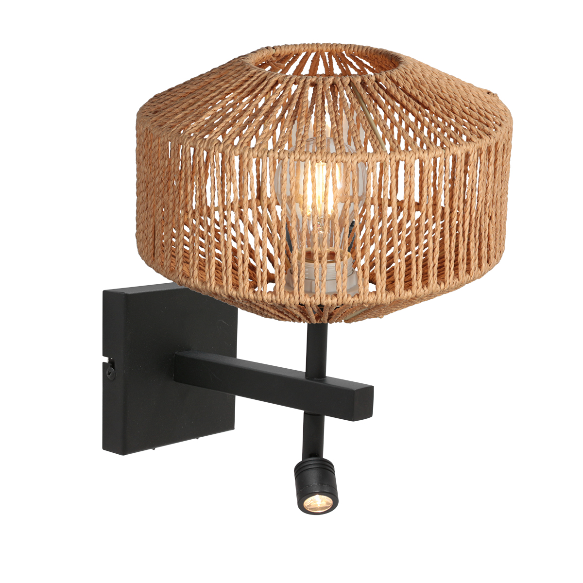 De wandlamp uit de Stang serie biedt een functionele en sfeervolle combinatie dankzij het zwarte metalen armatuur met geïntegreerd leeslampje én de compacte touwkap van 23 bij 15,5 centimeter. De E27 fitting ondersteunt lichtbronnen tot 40 watt, terwijl het extra leeslampje van 1 watt afzonderlijk te gebruiken is. Beide schakelaars bevinden zich onderaan de wandplaat voor eenvoudige bediening.
