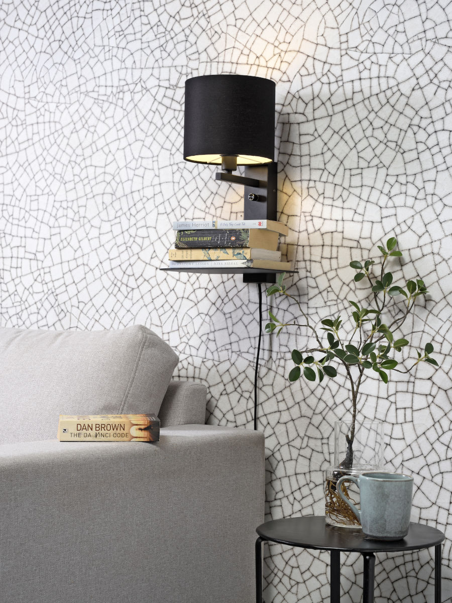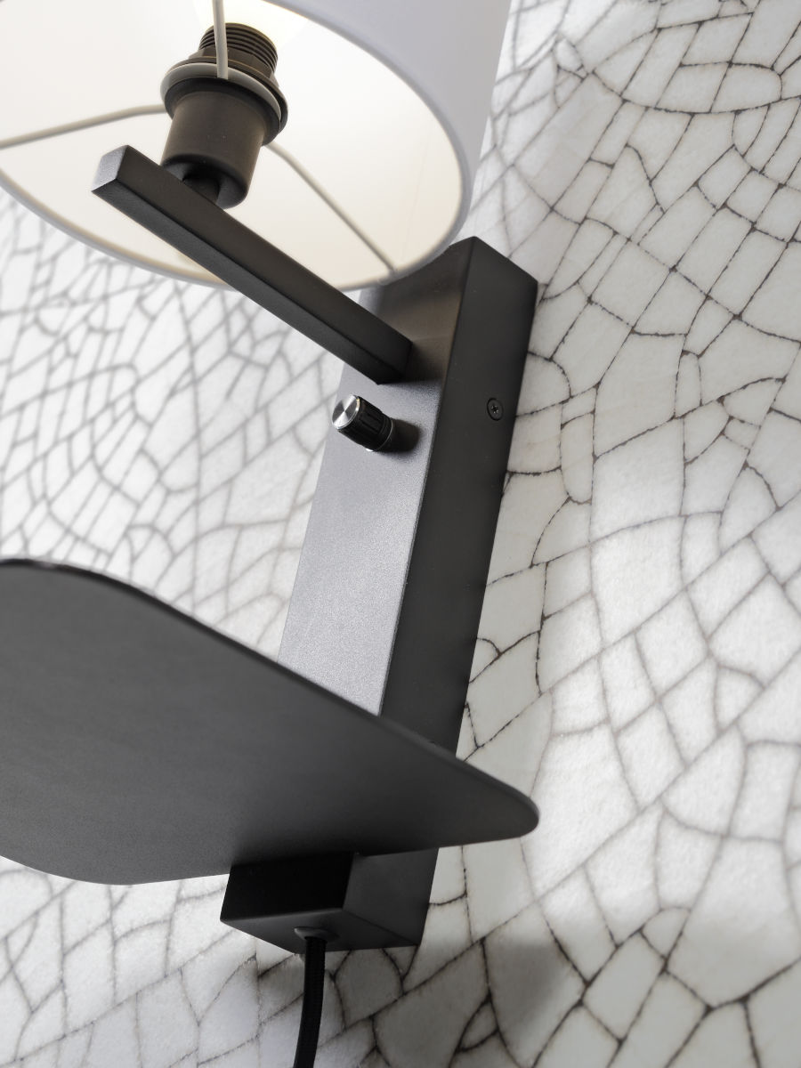 Zwarte wandlamp met plateau en moderne uitstraling. Perfect voor eetkamer, slaapkamer of woonkamer. Voorzien van een kleine E14 fitting en stofdicht (IP20). Een praktische en stijlvolle toevoeging aan je interieur.