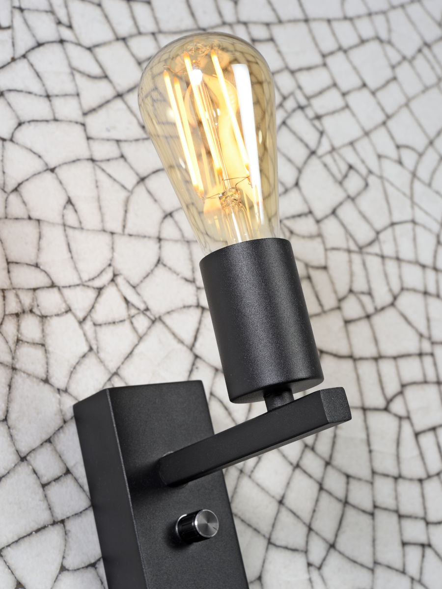 Zwarte wandlamp met plateau, zonder kap, straalt modern minimalisme uit. Geschikt voor eetkamer, slaapkamer of woonkamer. Voorzien van een grote E27 fitting en stofdicht (IP20). Voeg een vleugje eenvoud en stijl toe.